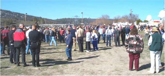 The Headgates Are Opened, a great crowd of supporters and irrigators Secretary Ann Veneman Speaking: All in attendance were not supportive: Protestors ? Thanks for the 4 photos above, Cory Thank you Barbara Hall for this photo back to page 1 All Photos are in the care of © klamathbasincrisis.org, 2002