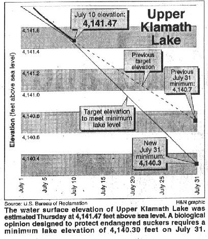 All eyes are on the Upper Klamath - Lake level chart will keep people posted, H&N's - July 1, 2003 - "To help interested parties keep abreast of the lake level daily, the Herald and News will publish a chart on weekdays showing the previous day's water level, and how the level compares to the target levels needed to protect endangered suckers."