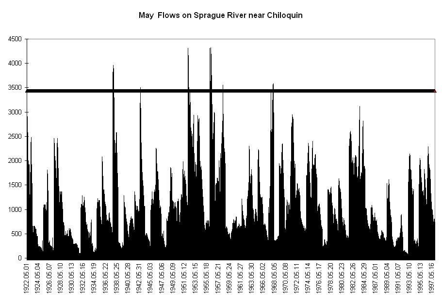 Graph showing actual flow back to 1922 compared to the Tribal instream claim (the flat line), when the graph drops below the flat line irrigators would not be able to irrigate, if the claim was granted. The claim is well in excess of actual flow especially in the period prior to 1954 when the tribes held the Reservation The tribes do not have specific instream water rights, but they have massive claims. The claims may ultimately grant the Tribes a lot of water or virtually nothing, depending upon the Klamath Adjudication. The Ninth Circuit Court Recently ruled on the Adair case, setting aside a lower court ruling the Tribes were seeking. Now the standard is back to the amount of water necessary to preserve the Tribes current hunting and fishing livelihood, not as it existed in 1864. What about the Environment? In 1925 the Tribal council states "We have sold 1,000,000,000 feet and 5,000,000,000 feet of timber yet to be sold." For reference purposes a billion board feet of boards if laid flat would completely cover 35 square miles of land.