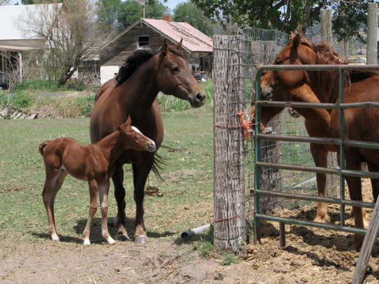 A 2-day old filly poses by her proud mamma. McLauchlin raises registered quarter horses for cutting, and makes specialized trophy saddles and leather pictures, some won by famous cutters.