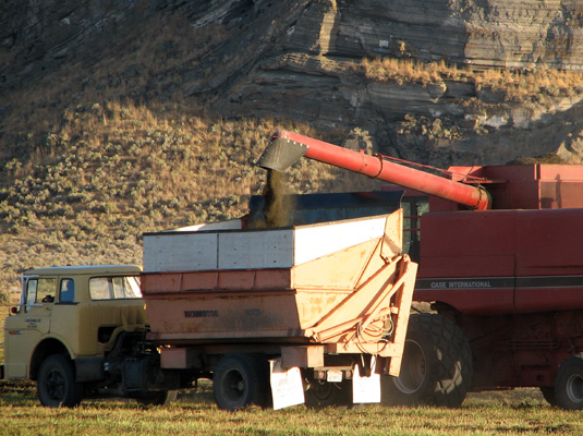 The harvester dumps the mint leaves into the truck designed for mint.