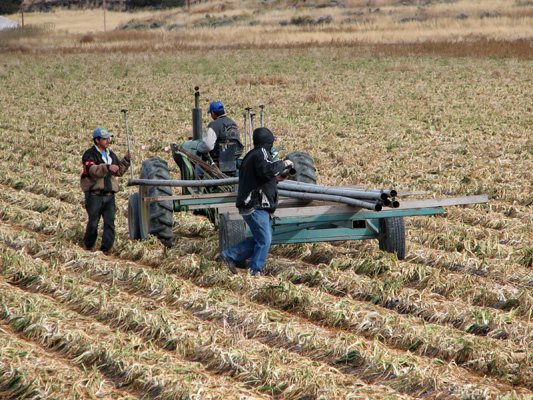 The men lift the irrigation pipes onto the pipe trailer so they prepare the field for onion harvest.