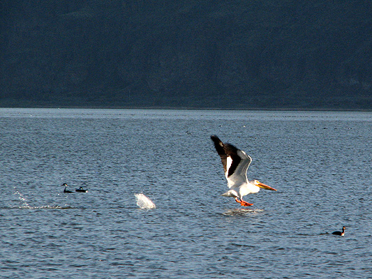 A pelican lands in the Tule Lake Wildlife Refuge bordering farmland. There are 13,685 acres of open water and marsh in the Tule Lake Refuge alone.