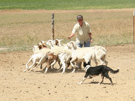 Ellen Skillings from Tulelake demonstrates the inherited traits of her young untrained sheepdog. Ellen trains breeds and trains sheepdogs and cow dogs, edits sheepdog training videos, and works with Geri Byrne putting on clinics and trials; dog handlers come from around the world to participate. She also works with the cattle on the Byrne ranch.