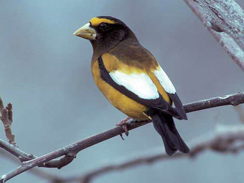 Evening Grosbeak male Evening grosbeaks are an uncommon year-round resident often seen in loose flocks. In addition to coniferous forests, they may be seen in residential areas in years when seed crops are scarce at higher elevations.