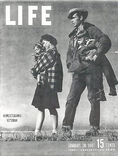 Gallery 10 Dale Sprout, a WWII veteran, won a Tulelake Homestead in 1947. He brought his young family to Tulelake, in the Klamath Basin, to farm his 80-acre field to grow food for a hungry nation. There were no roads, no electricity, no running water; they were given an old barracks, cot, and barrel of nails by the United States Government to build their home and farm. There were 20 feet of water on their farm before the Klamath Reclamation Project was built. The Project took water off his land and put it into canals and ditches, wildlife refuges and the Klamath River. Since Tule Lake was in a closed basin, there was previously no way for water to escape. So Reclamation blasted a tunnel through Sheepy Ridge. Irrigators pump this excess water uphill at their own expense, through the tunnel, and it ends up in the Klamath River to create power. In exchange for this water diverted into the river, the Sprouts were given a permanent water right of 2 1/2 acre feet of water for them and their heirs forever, signed by the President of the United States. photo: Life Magazine